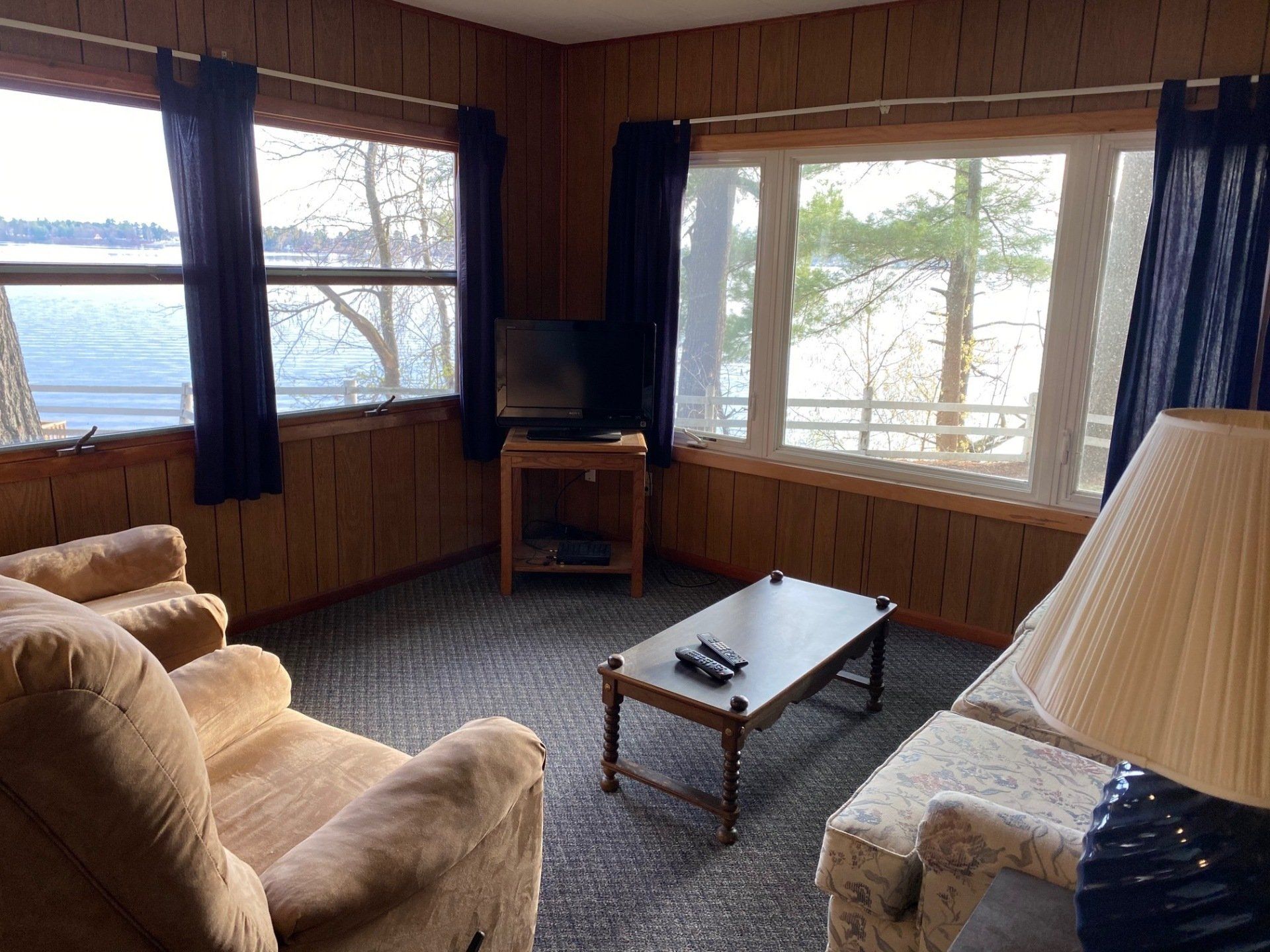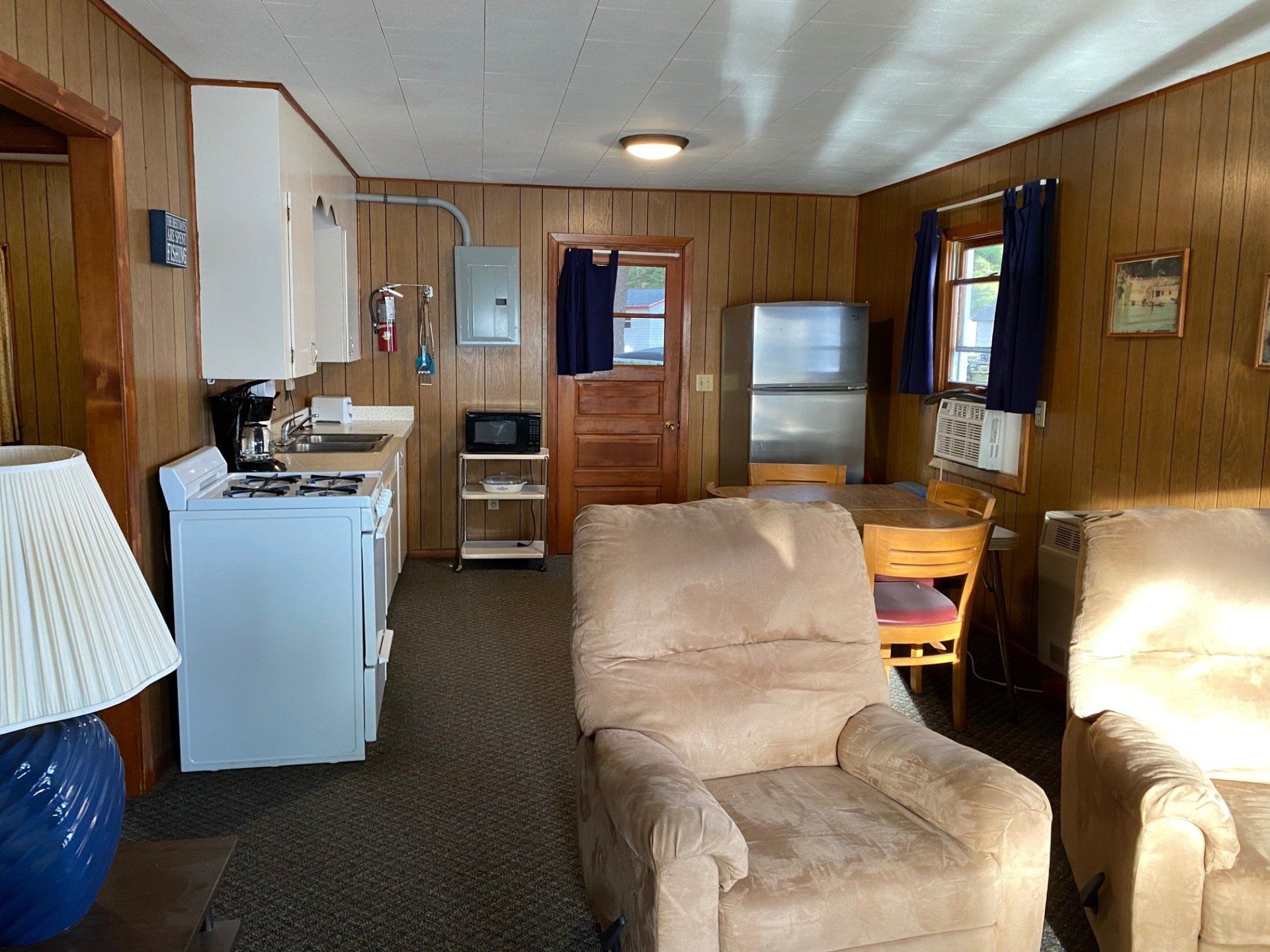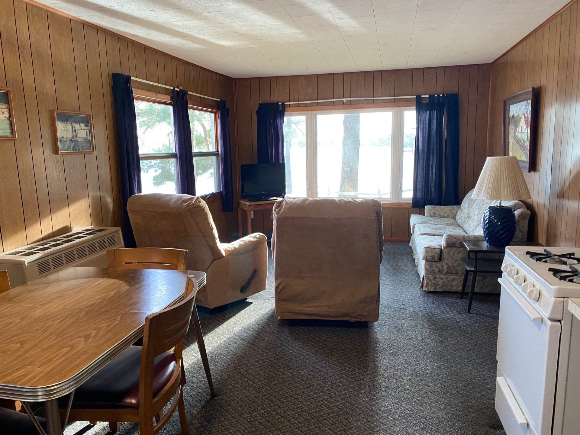 Living room includes pull-out couch, 2 recliners, Color Cable TV.