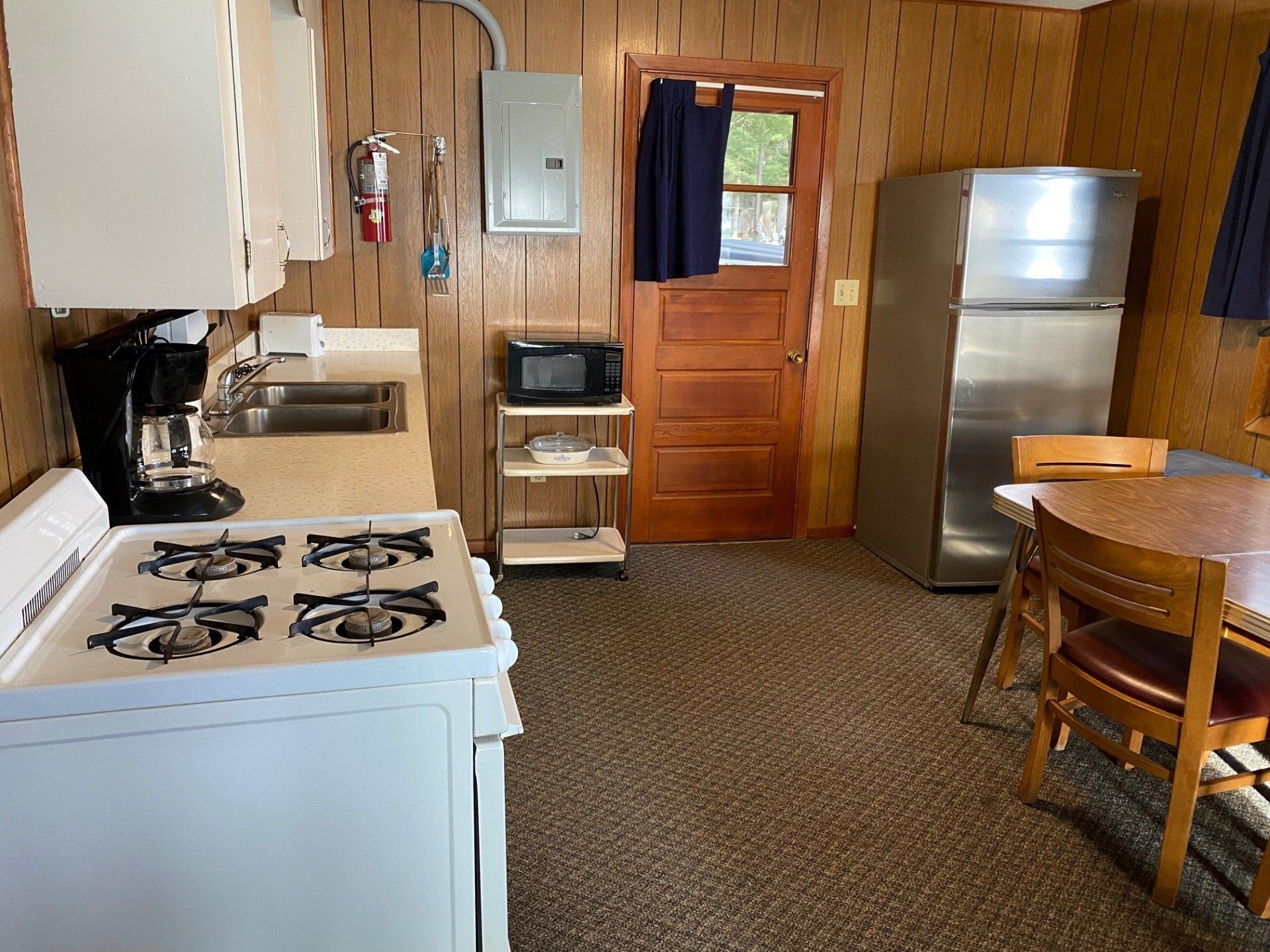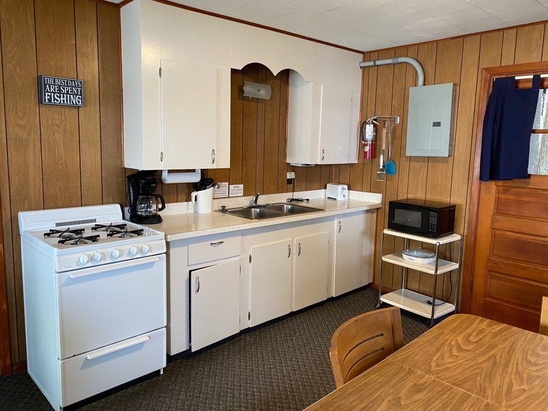 Kitchen is furnished with dishes, pots, pans, drip coffee maker, toaster, utensils and microwave.