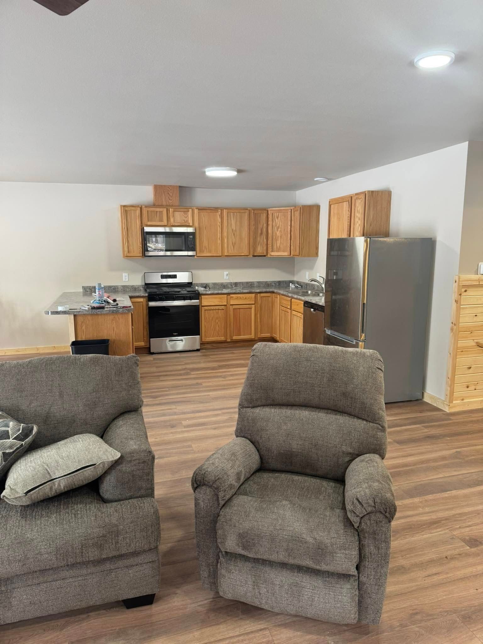 You’ll enjoy a fully equipped kitchen with full-size appliances and a dishwasher, plus a cozy living room with a 65” TV, cable, and internet. Shared coin laundry is available in the center of the duplex for your convenience.